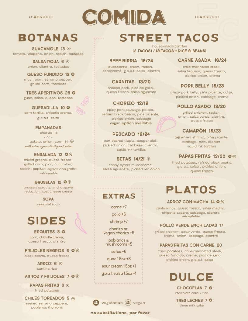 thin sliced marinated steak, tortillas blancas, chiles toreados, salsa taquera, crema, rice & beans (sub papas fritas +1)